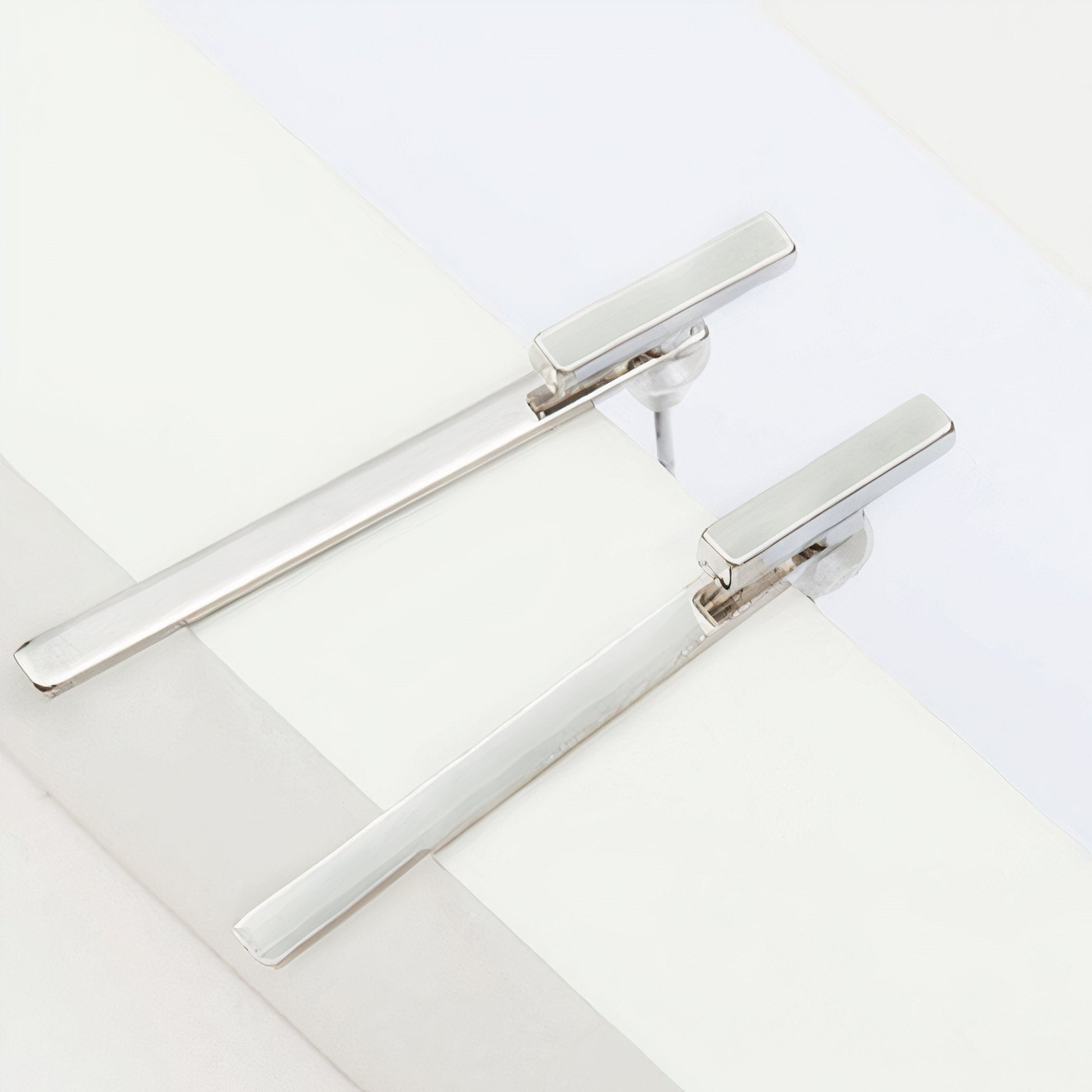Geometric style, jacket earrings with flat, metallic bars. Wear both pieces in the front of the ear lobe or the longer piece on the back of the ear lobe. Gold and silver plated.